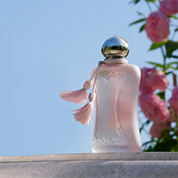 Delina La Rosée evokes fresh morning dew caressing rose petals. It opens with vibrant lychee, revealing a heart of damascena rose and delicate flowers, settling on velvety white musks. Luminous and refreshing.